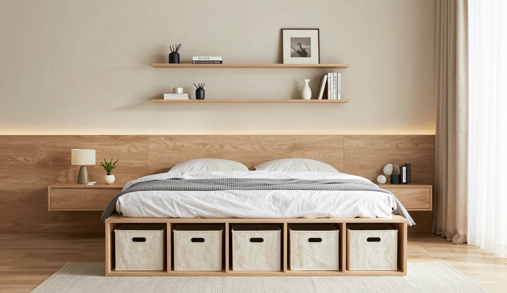 Clutter breaks a good design. Smart storage is a way to make the room peaceful. Off-season clothes or additional blankets are stored underneath the bed boxes. Floating shelves are used to showcase decor and they do not occupy any floor space.