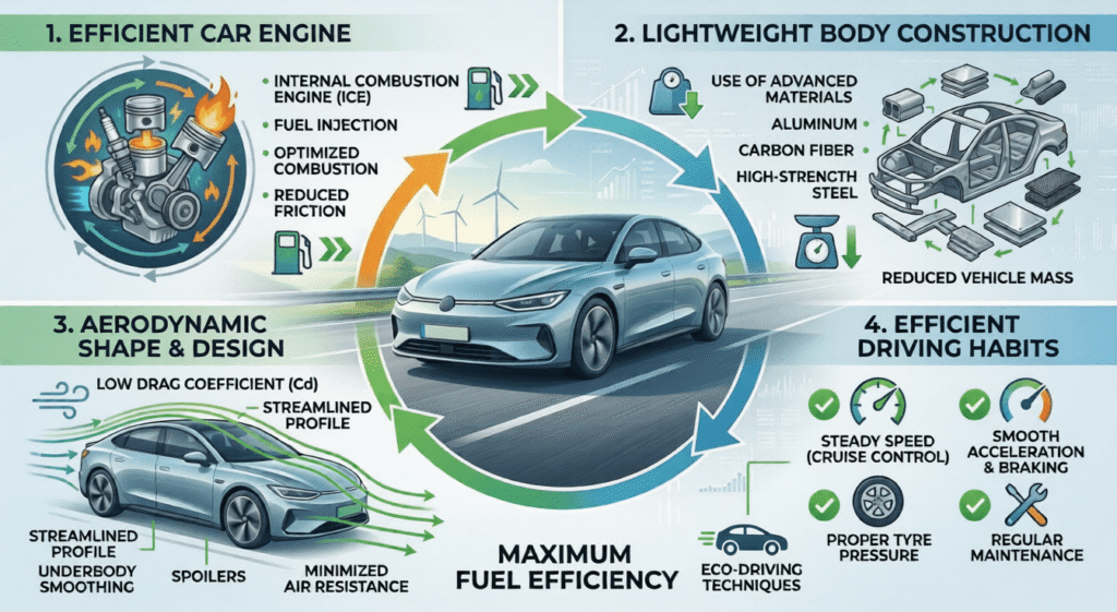 Also, the shape of the car influences air movement. Sleek designs reduce drag. Thus, the engine does not work as much and conserves fuel.