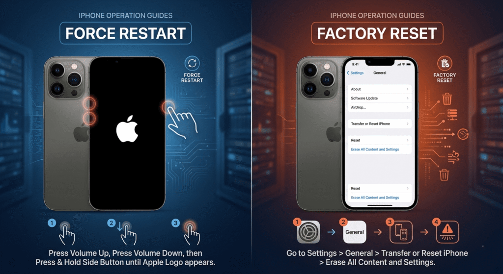 Use force restart for minor issues. Only perform a factory reset when necessary.