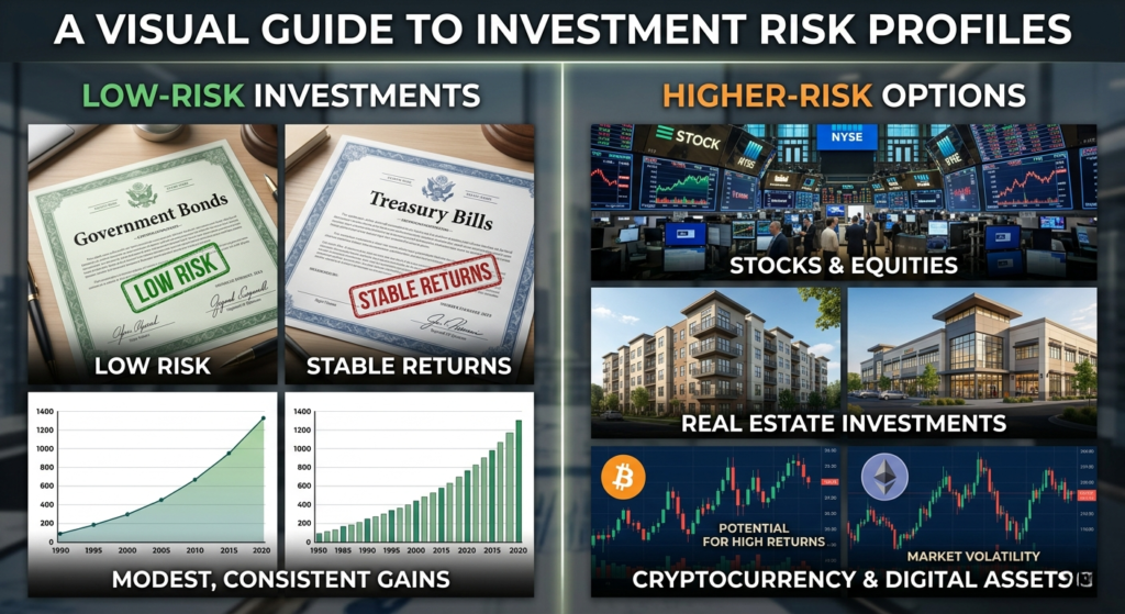- Low-risk investments – bonds, certificates of deposit, treasury bills.